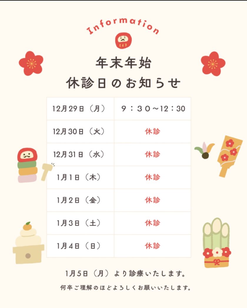 年末年始の休診日について 投稿日:2025.12.09 年末年始の休診日について 年内の診療は12月29日(月)の午前中までとさせて頂きます。 年明けは1月5日(月)から通常通りの診療になります。 ご迷惑をおかけしますが、よろしくお願い致します。 来院時には、マイナンバーカード(資格確認証)、お薬手帳をお持ちください。 当院は予約制ですので、予めお電話にてお問い合わせください。